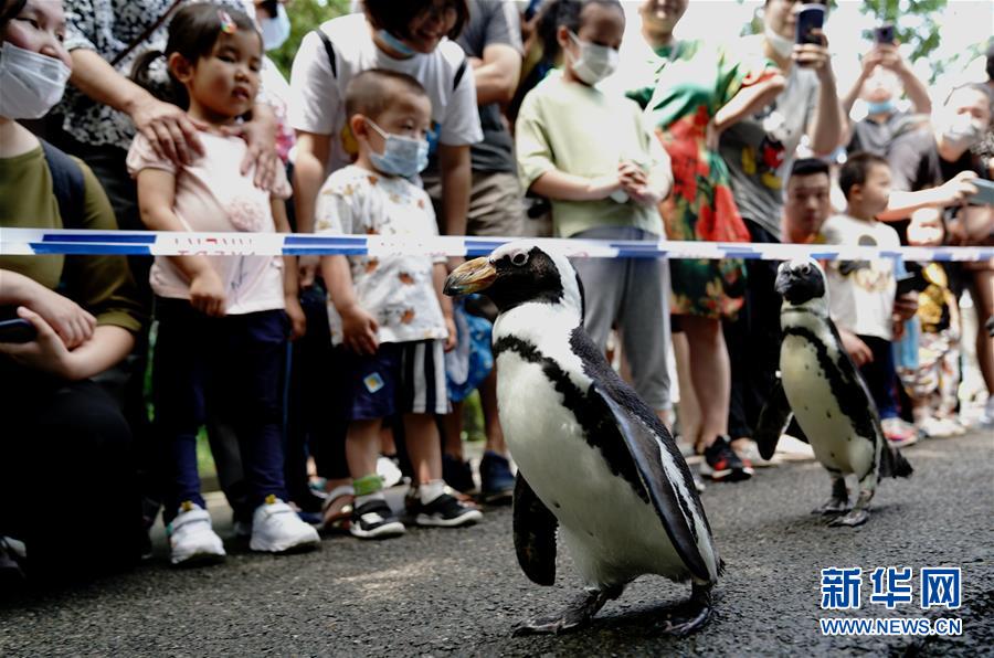 6月26日,上海動物園飼養員引導企鵝在園內漫步。端午小長假第二天,上海動物園開展“企鵝漫步科普行”活動,受到游客歡迎。新華社記者 張建松 攝