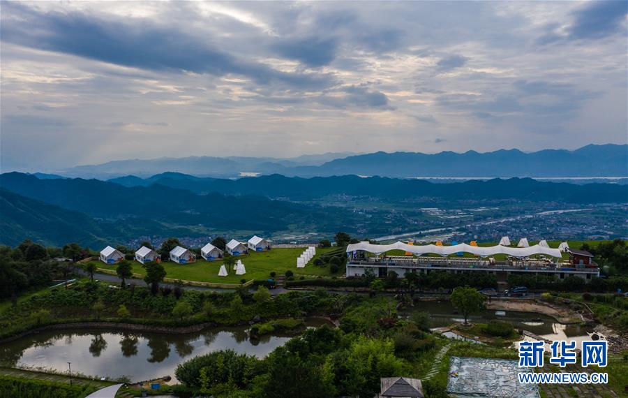 空中俯瞰杭州市富陽區常安鎮永安山頂的帳篷酒店(6月27日攝,無人機照片)。近期,浙江省杭州市富陽區場口鎮、常安鎮和湖源鄉組團開啟了一場夏季“綠水青山嘉年華”。這幾個壺源溪流域鄉鎮整合生態旅游資源,組團開發山村旅游項目,游客可以參與壺源溪水上游樂、露營永安山頂、特色農產品集市和瓜果節等特色活動。新華社記者徐昱攝