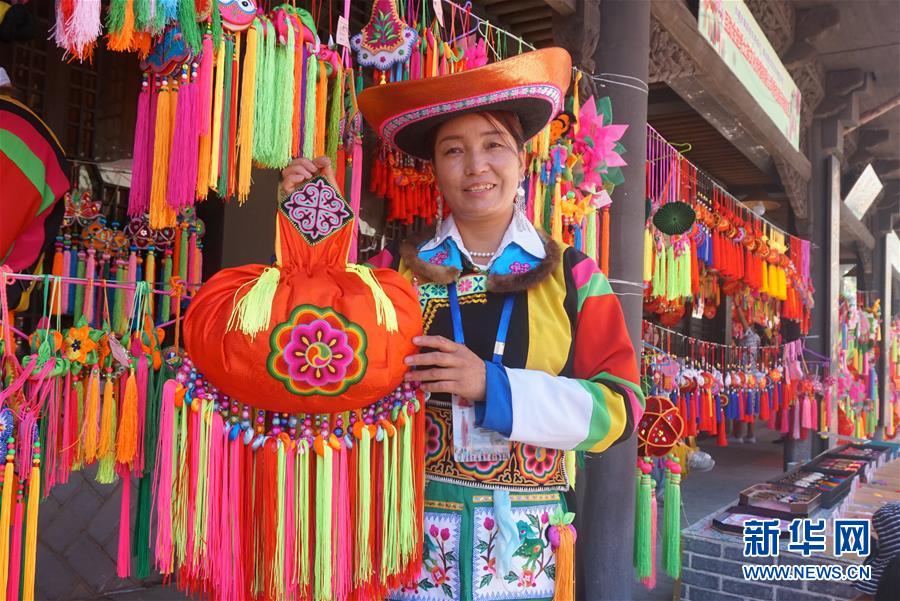 6月24日,繡娘胡蘭索卡在青海省互助土族自治縣舉辦的端午節(jié)香包“選美”大賽上展示她的作品。新華社記者解統(tǒng)強(qiáng)攝