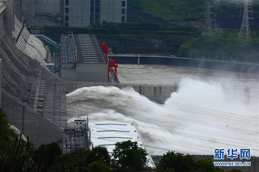 6月29日,三峽樞紐開啟泄洪孔泄洪。受長江中上游強降雨影響,進入三峽水庫的水量持續增多。為騰出一定庫容迎接近期可能到來的洪水,三峽樞紐于6月29日上午開啟兩個泄洪孔,加大下泄流量。這是三峽樞紐今年首次泄洪。28日14時,三峽水庫入庫流量達4萬立方米/秒,是27日14時的兩倍。為應對此輪來水,長江防總要求將三峽水庫下泄流量上調至日均3.5萬立方米/秒。新華社發(鄭家裕攝)