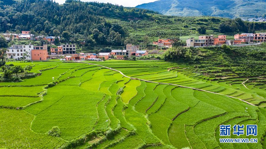 貴州省盤州市新民鎮的梯田風光(6月29日攝,無人機照片)。夏日時節,貴州省盤州市新民鎮的梯田風景如畫。新華社記者陶亮攝