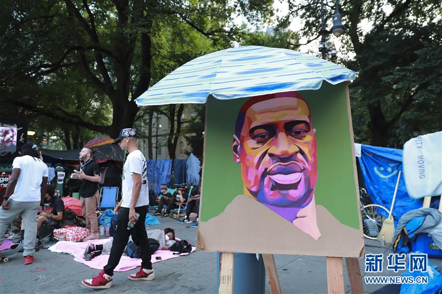這是6月30日在美國紐約市政廳外“占領市政廳”抗議活動現場拍攝的弗洛伊德畫像。由美國明尼蘇達州明尼阿波利斯市非裔男子弗洛伊德遭白人警察暴力執法而死一事引發的各種抗議活動仍在紐約持續進行。新華社記者王迎攝