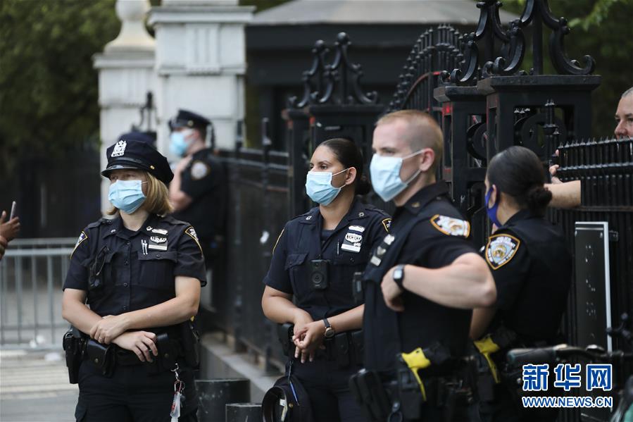 6月30日,警察在美國紐約市政廳附近執勤。由美國明尼蘇達州明尼阿波利斯市非裔男子弗洛伊德遭白人警察暴力執法而死一事引發的各種抗議活動仍在紐約持續進行。新華社記者王迎攝