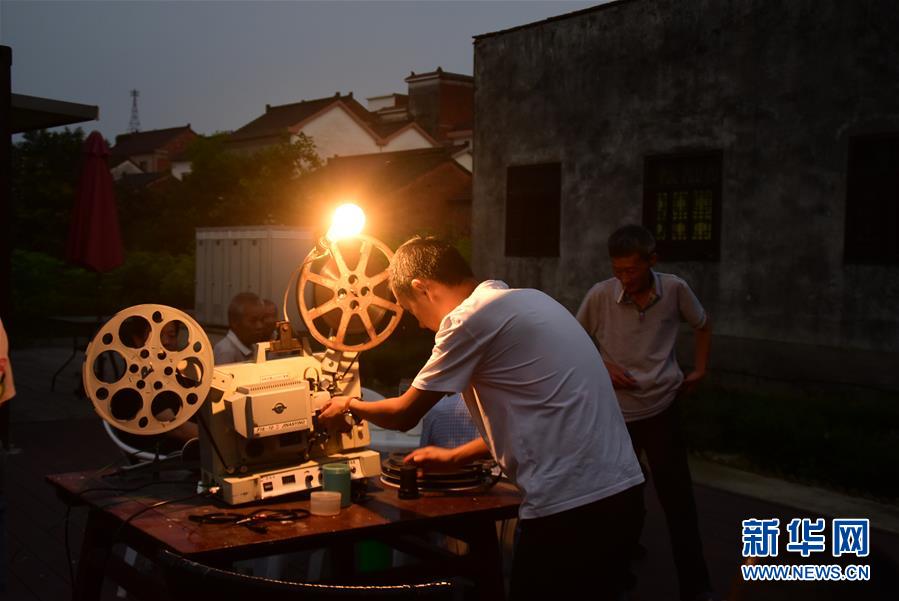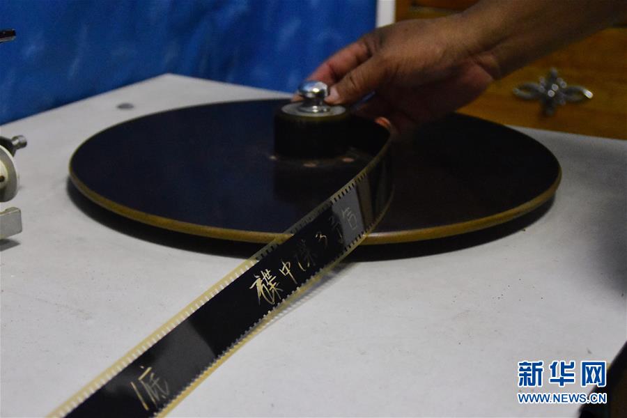 6月30日晚,電影放映中,朱強在更換膠片。新華社記者鄭夢雨攝