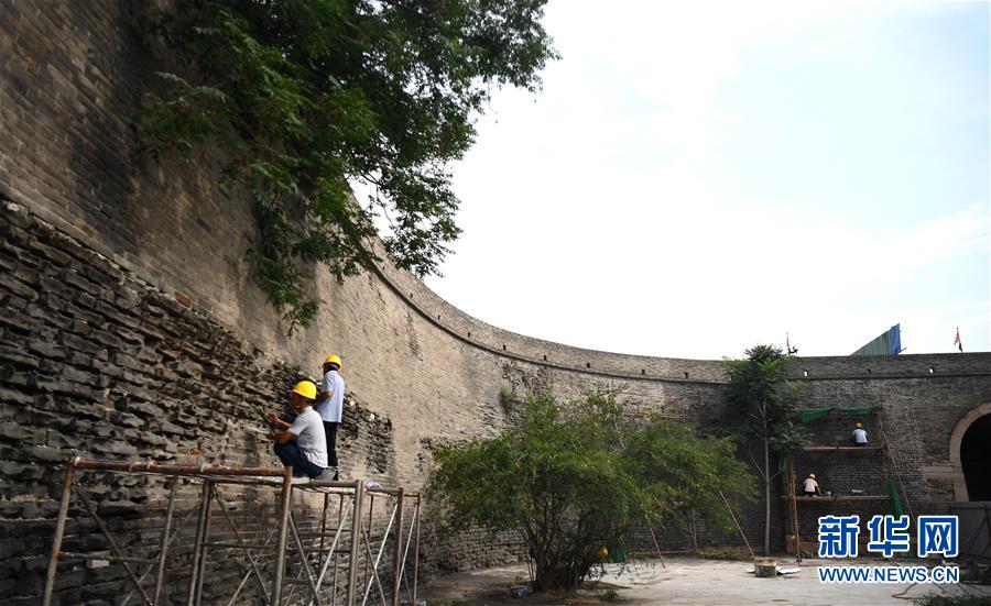 7月2日,工作人員在永年廣府古城修繕城墻。經國家文物局和河北省文物局批準,河北永年廣府古城修繕工程已全面啟動。在文物專家全程參與下,按照“不改變文物原狀”原則進行修繕,預計2021年4月底完工。永年廣府古城擁有華北地區保存最完整的古城墻,現為全國重點文物保護單位。新華社記者王曉攝