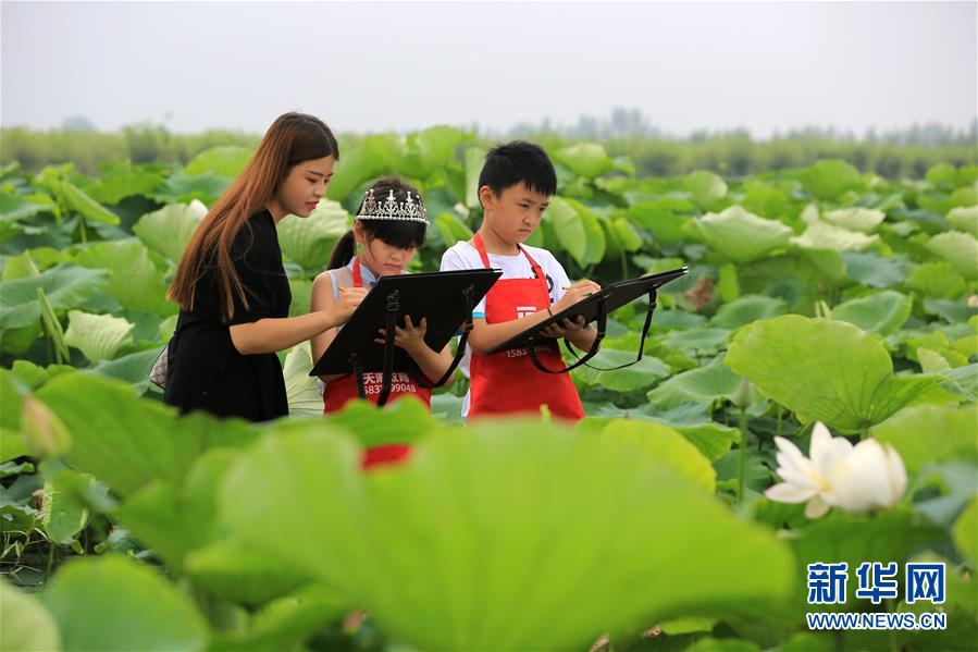 7月3日,游客在曲周縣勝豐蓮藕種植專業合作社荷塘景區寫生。時值夏日,河北省曲周縣勝豐蓮藕種植專業合作社荷塘景區的荷花競相綻放,吸引眾多游人前來觀光游覽。新華社記者 王曉 攝