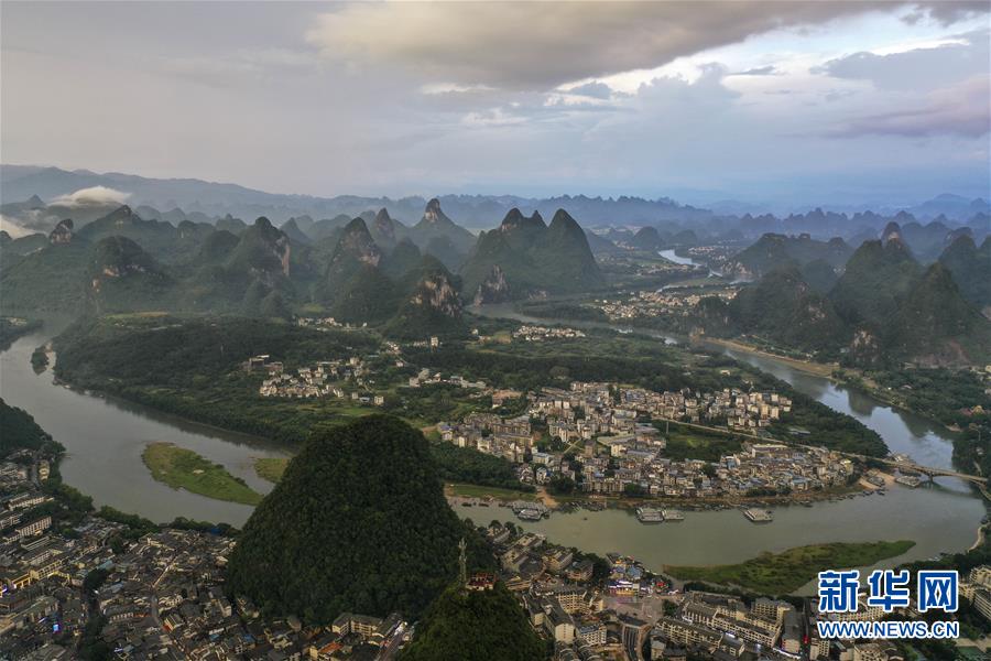 7月4日拍攝的廣西陽朔縣景色(無人機照片)。時值夏日,廣西桂林市陽朔縣景色宜人,青山綠草、藍天白云構成一幅幅美麗的山水畫卷。新華社記者曹祎銘攝