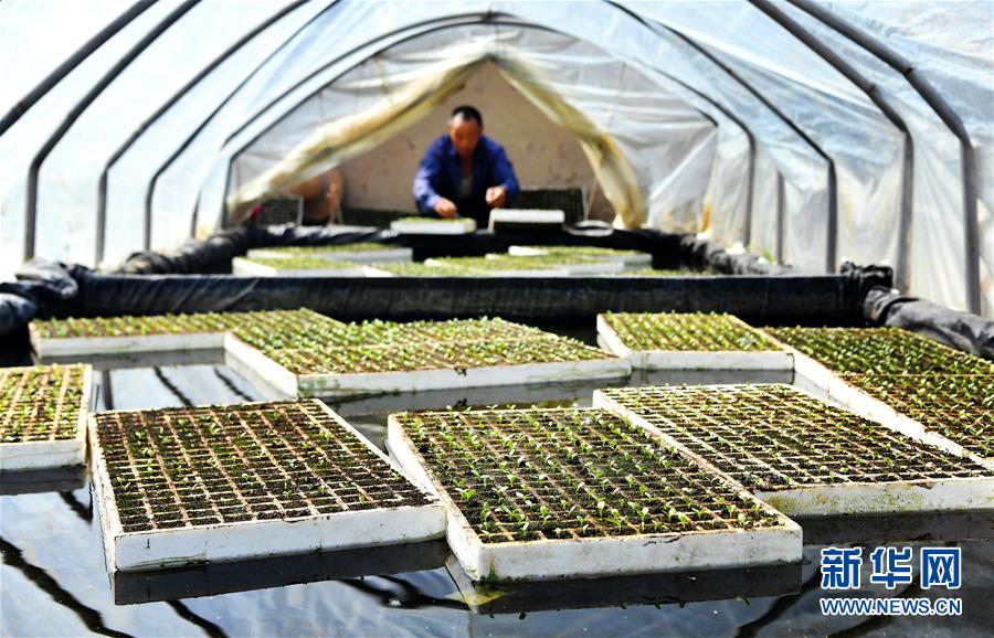 陜西太白縣咀頭鎮塘口村的村民通過“漂浮育苗”的方式進行蔬菜育苗(7月4日攝)。新華社記者劉瀟攝
