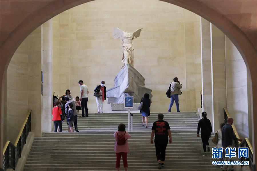 7月6日,在法國巴黎盧浮宮博物館,人們參觀雕塑《薩莫色雷斯勝利女神》。因新冠病毒疫情關閉3個多月后,法國盧浮宮博物館于6日重新開放。新華社記者高靜攝