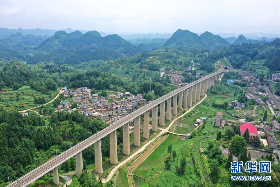 7月6日拍攝的安六鐵路岱港村特大橋(無人機(jī)照片)。當(dāng)日,新建貴州安六鐵路(安順至六盤水)聯(lián)調(diào)聯(lián)試工作進(jìn)入收尾階段,開通前的各項準(zhǔn)備工作已基本就緒。安六鐵路線路全長約125公里,設(shè)計時速250公里,為國家I級雙線客運專線。建成投用后,貴陽至六盤水的鐵路旅行時間可從現(xiàn)在的3.5小時縮短為1小時左右,貴州省六盤水市將全面接入全國高鐵網(wǎng)。新華社記者劉續(xù)攝