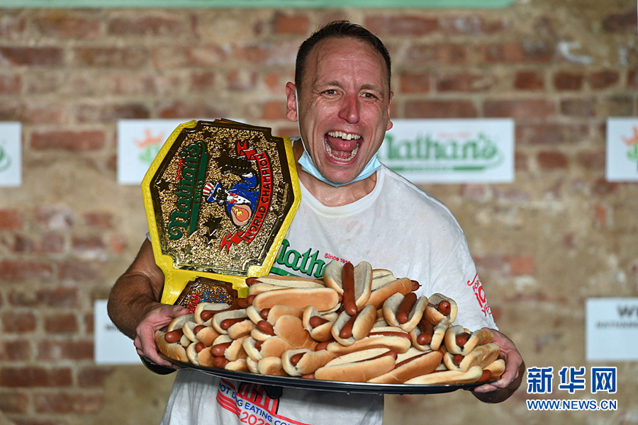 7月4日,美國紐約布魯克林舉行一年一度的國際吃熱狗比賽,喬伊·切斯納特以吃75個熱狗的成績贏得男子賽區(qū)冠軍,創(chuàng)下了新的世界紀錄。(圖片來源:視覺中國)