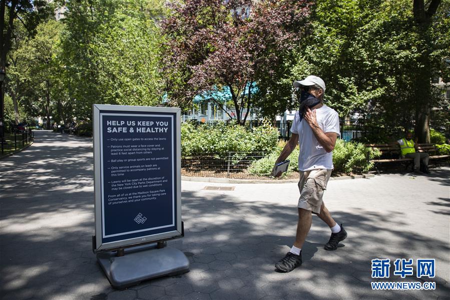 7月6日,行人走過美國紐約一處公園內的提示牌,上面寫有防疫須知和公園管理規定。