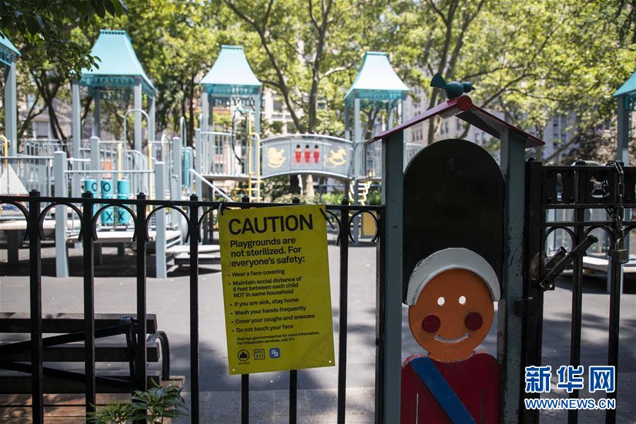 7月6日,美國紐約一處兒童游樂園的入口貼著防疫提示。新華社記者王迎攝