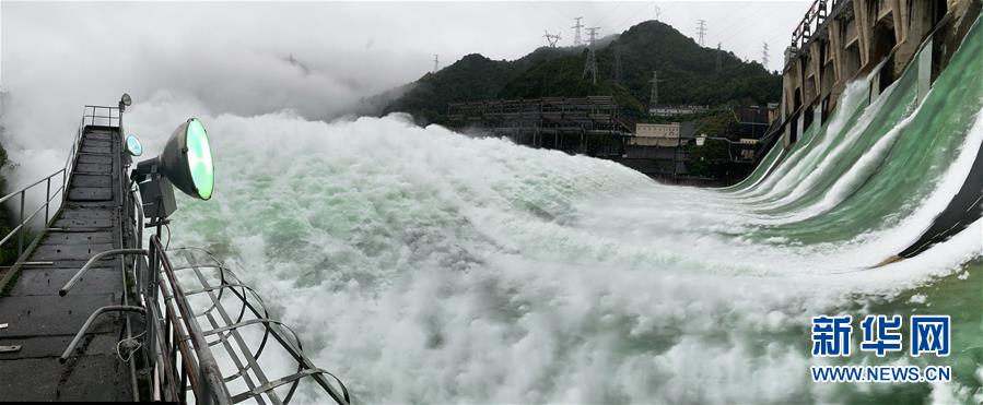 7月7日下午開啟7孔泄洪的新安江水庫(手機全景模式拍攝)。受持續降水影響,浙江新安江水庫水位持續快速上升。繼當日10時開啟3孔、12時開啟5孔泄洪后,新安江水庫于16時增加到7孔泄洪。新安江水庫是華東地區最大的水庫,在錢塘江流域的防洪度汛中起到關鍵作用。新華社記者翁忻旸攝