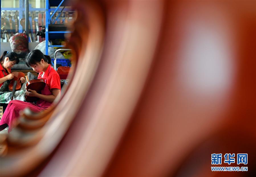 工人在河南駐馬店市確山縣提琴產業園提琴生產車間工作(7月3日攝)。新華社記者李嘉南攝