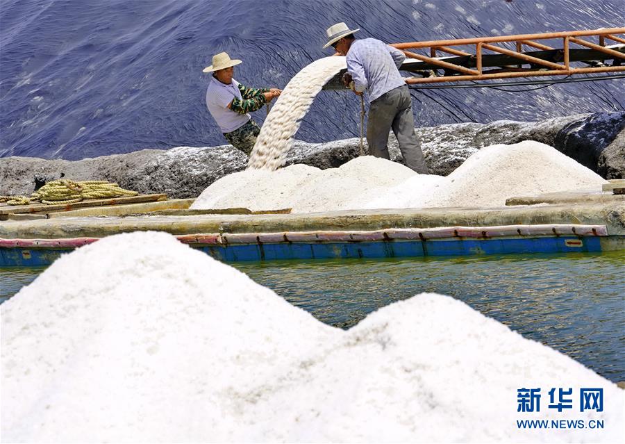 7月9日,唐山市曹妃甸區南堡鹽場的工人將收獲的春鹽裝船。在我國長蘆鹽區海鹽生產基地之一的河北省唐山市曹妃甸區南堡鹽場,一年一度的春鹽收獲工作即將結束,今年南堡鹽場的春鹽產量預計可達72萬噸。新華社記者楊世堯攝