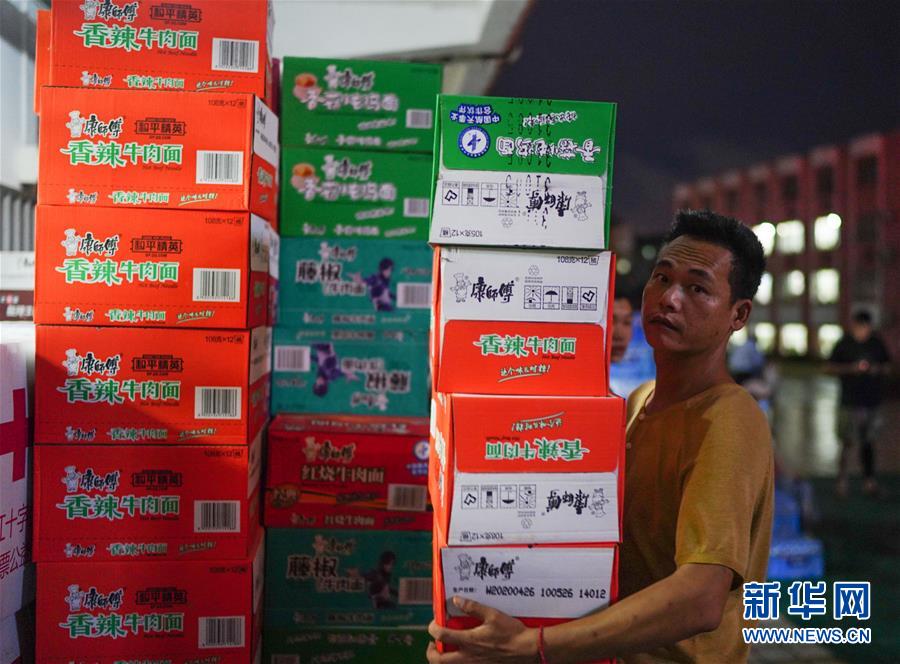 7月9日,工作人員在搬運供安置點村民食用的方便面。當日,江西鄱陽縣鄱陽鎮因洪水受災的村民被轉移到多個集中安置點。在鄱陽縣五一中心學校安置點,志愿者和工作人員接到任務后不到十小時內,為被轉移村民布置了28間教室,供519人安頓,并為村民發放褥子、床單、枕頭、盒飯、飲用水等物資。新華社記者周密攝