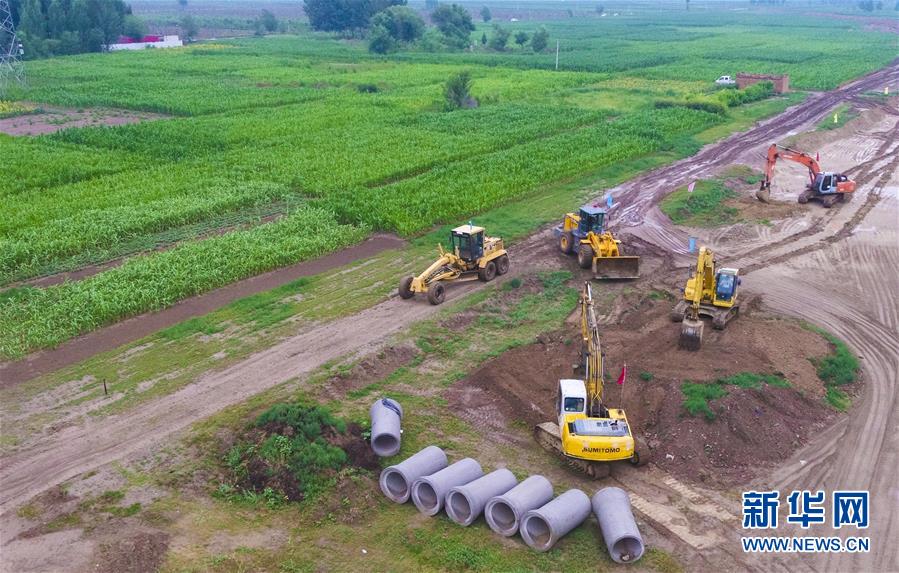 7月9日,工人在文安縣孫氏鎮孫文線建設現場施工。該條公路全長9.7公里,預計建成后將帶動縣域南部近40個村街發展(無人機照片)。近年來,河北省文安縣推進實施縣鄉公路改造、窄路基路面拓寬、村社道路硬化、危橋改造、安全生命防護等工程,不斷完善農村物流網絡,推動城鄉交通基礎設施互聯互通。新華社記者李曉果攝