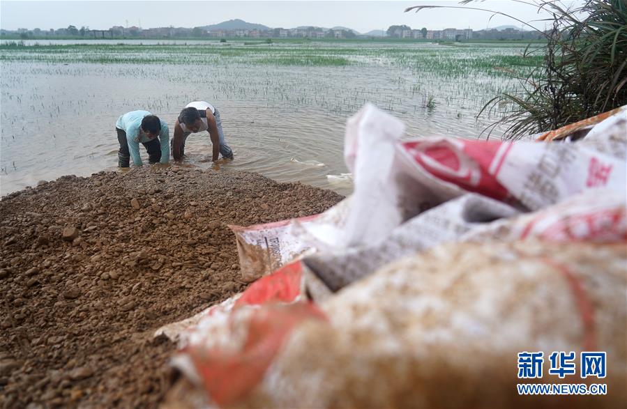 7月9日,為應對洪峰到來,邵忠如(左)在水中加固圩堤。新華社記者萬象攝