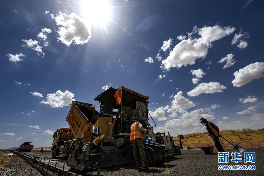 7月10日,工人在位于寧夏境內的烏瑪高速青銅峽至中衛段A10標段施工。盛夏時節,位于寧夏境內的烏瑪(內蒙古烏海市至青海瑪沁縣)高速青銅峽至中衛段正在抓緊施工建設。該路段主線全長122.9公里,其中穿越騰格里沙漠腹地的18公里公路是寧夏建設的首條沙漠高速公路,預計2021年建成通車。新華社記者馮開華攝。