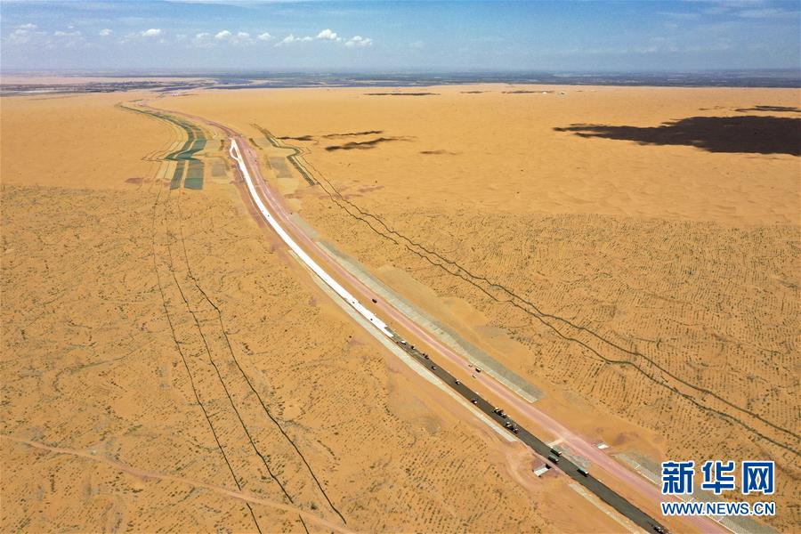 烏瑪高速青銅峽至中衛段穿越騰格里沙漠的18公里路段,與中國首條沙漠鐵路——包蘭鐵路交匯(7月10日攝,無人機照片)。盛夏時節,位于寧夏境內的烏瑪(內蒙古烏海市至青海瑪沁縣)高速青銅峽至中衛段正在抓緊施工建設。該路段主線全長122.9公里,其中穿越騰格里沙漠腹地的18公里公路是寧夏建設的首條沙漠高速公路,預計2021年建成通車。新華社記者馮開華攝。