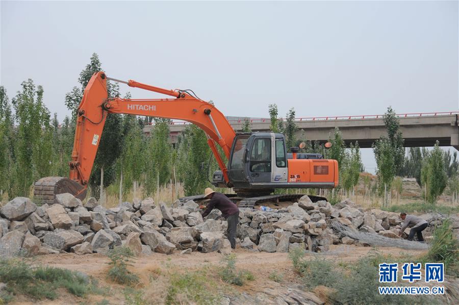 7月11日,工人在黃河內(nèi)蒙古磴口段南套子險(xiǎn)工段進(jìn)行除險(xiǎn)加固。新華社記者李云平攝