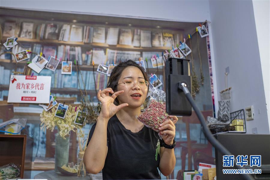 在位于新疆精河縣城的工作室內,朱虹美通過手機向網友介紹真空包裝的枸杞產品(7月11日攝)。新華社記者 胡虎虎 攝