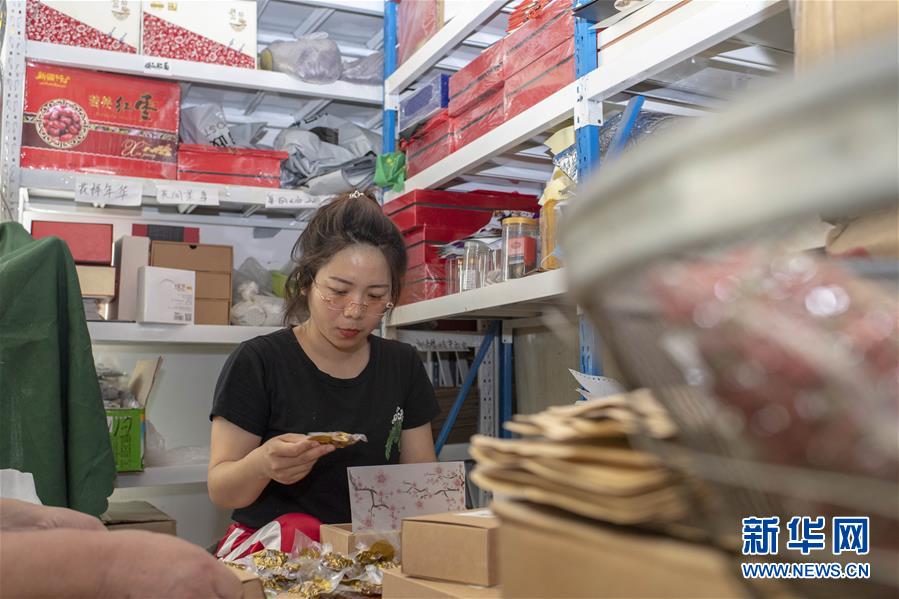 在位于新疆精河縣城的工作室內,朱虹美按網友訂單打包干果產品(7月11日攝)。新華社記者 胡虎虎 攝