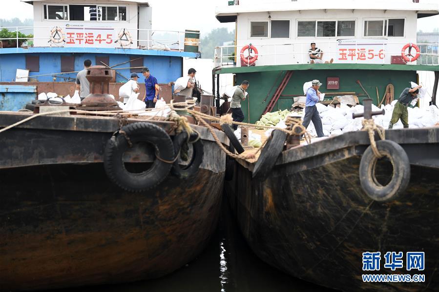 7月14日,當地村民往船只上搬運砂石袋。近日,受洪水影響,安徽省望江縣華陽鎮境內的江調圩內部道路漫水,搶險車輛無法進入。當地防汛部門組織船只裝載砂石袋等防汛物資,運往圩堤保防汛。新華社記者 劉軍喜 攝