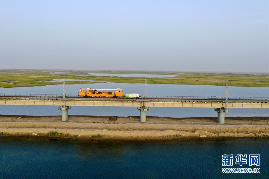 鋼軌打磨車在臺特瑪湖特大橋上作業(7月14日攝,無人機照片)。新華社記者 丁磊 攝