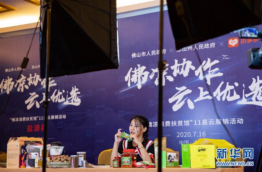 7月16日,直播主持人在電商直播間推介涼山農特產品。新華社記者江宏景攝
