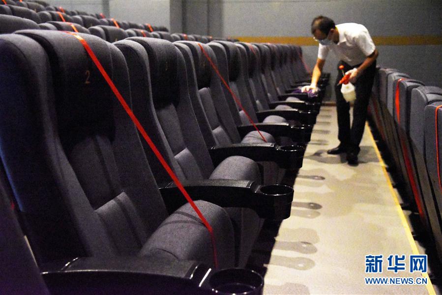 2020年7月19日,上海影城員工在放映廳里為座位消毒。當日,上海部分電影院為恢復開放營業進行最后階段準備。新華社記者任瓏攝