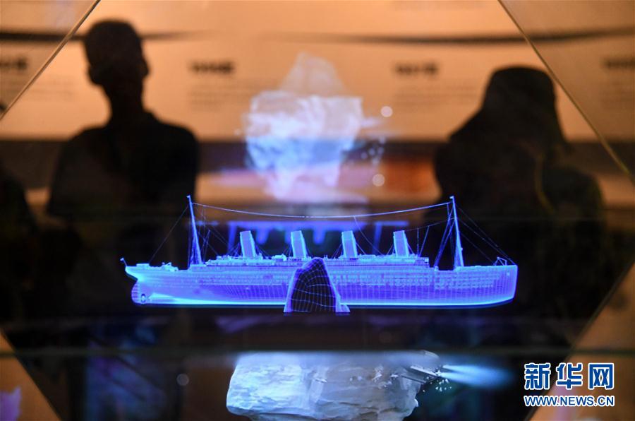 2019年8月28日,參觀者在電影博物館內觀看“泰坦尼克號”數字模型全息演示。當日,2019青島國際影視博覽會舉行青島電影博物館探館活動。新華社記者李紫恒攝