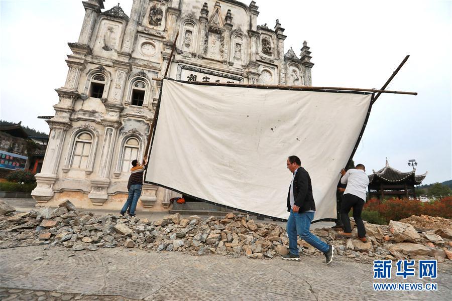 2019年3月19日,在天柱縣坌處鎮三門塘村,黃宜印(中)在搭建電影播放幕布。侗族青年黃宜印是貴州省黔東南苗族侗族自治州天柱縣的一名公益電影放映員。從2014年起,他常年行走在大山里,為山區群眾播放電影。僅2018年,黃宜印就在天柱縣的37個村寨播放電影444場。新華社記者歐東衢攝