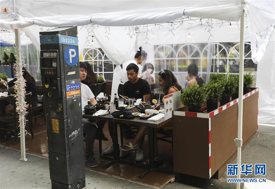 7月23日,在美國紐約,人們在戶外就餐區用餐。美國約翰斯·霍普金斯大學23日發布的新冠疫情最新統計數據顯示,美國累計確診病例超過400萬例。數據顯示,截至美國東部時間23日15時34分(北京時間24日3時34分),美國累計確診病例4007859例,累計死亡病例143846例。新華社記者王迎攝