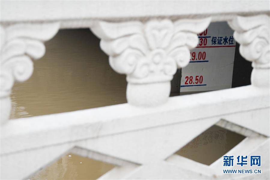 這是7月23日在安徽省阜南縣拍攝的關閘后的淮河王家壩閘閘下水位。當日13時,淮河干流王家壩閘關閘,停止向蒙洼蓄洪區泄洪。新華社記者張端攝