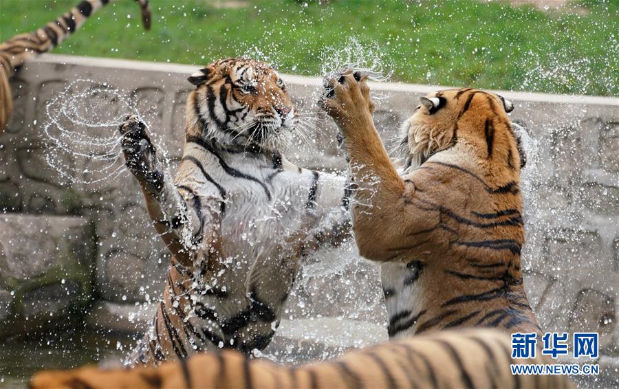 7月28日在橫道河子東北虎林園拍攝的在水中納涼的東北虎。時值盛夏,位于黑龍江省海林市的橫道河子東北虎林園的東北虎活動量減少,以不同方式消夏納涼。新華社記者王建威攝