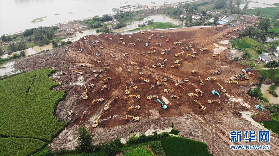 7月28日,在姜唐湖蓄洪區戴家湖一處涵閘險情處置現場,人們操作機械設備在搶筑臨時圩堤(無人機照片)。新華社記者張端攝