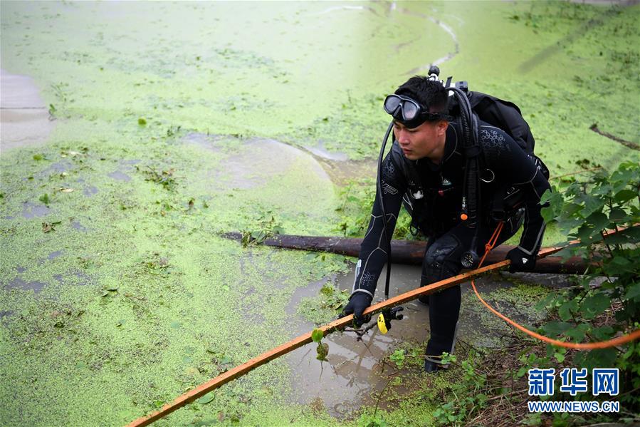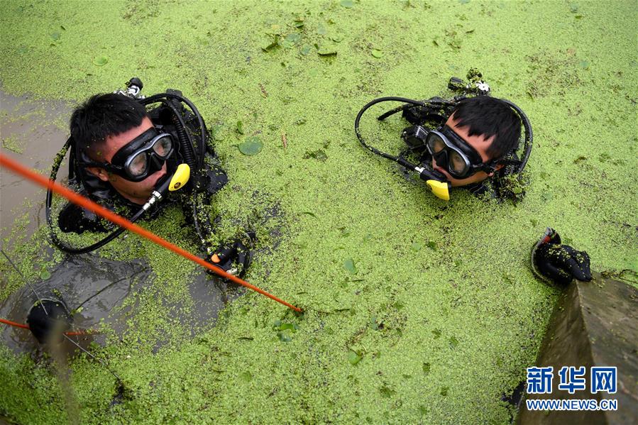 7月24日,在安徽省廬江縣臺創園小南河段,吳正寶(左)和徐宏林準備潛水。新華社記者劉軍喜攝