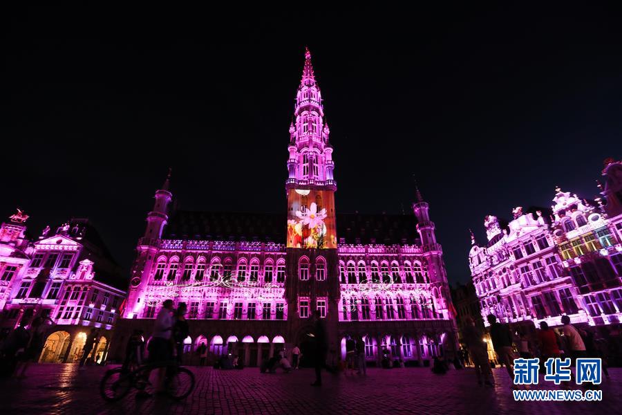 7月29日,人們在比利時布魯塞爾大廣場欣賞聲光秀。7月29日,比利時布魯塞爾大廣場舉行大型聲光秀。藝術(shù)家在市政廳等歷史建筑上投影文字和圖案,紀念這個夏天受新冠疫情影響而不能如期舉辦的文化活動。新華社記者鄭煥松攝