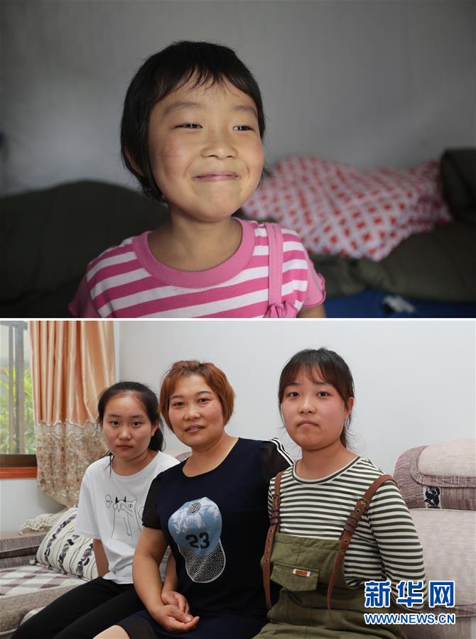 拼版照片:上圖為2010年8月20日,盼望開學的小雪梅在受災群眾安置點的帳篷內(新華社記者任正來攝);下圖為2020年7月14日,雪梅(右)和母親、妹妹在一起(新華社記者杜哲宇攝)。新華社發