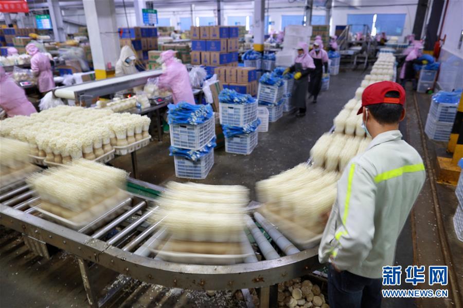 8月6日,工作人員在威寧雪榕生物科技有限公司包裝金針菇。新華社記者劉續攝