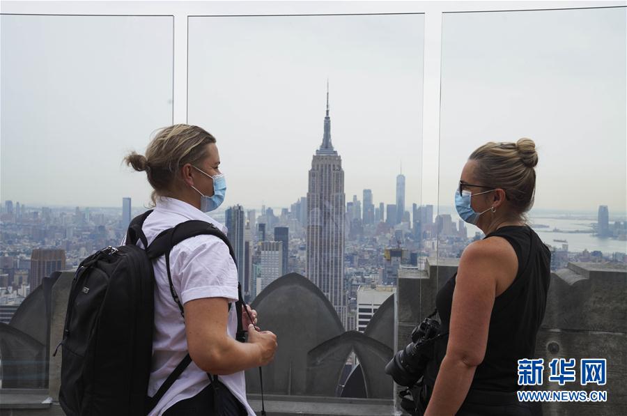 8月6日,在美國紐約,人們在洛克菲勒中心觀景臺上觀看城市景觀。當日,3月份暫時關閉的洛克菲勒中心觀景臺恢復對公眾開放。每天13時至21時,人們可戴口罩前往參觀。新華社記者王迎攝