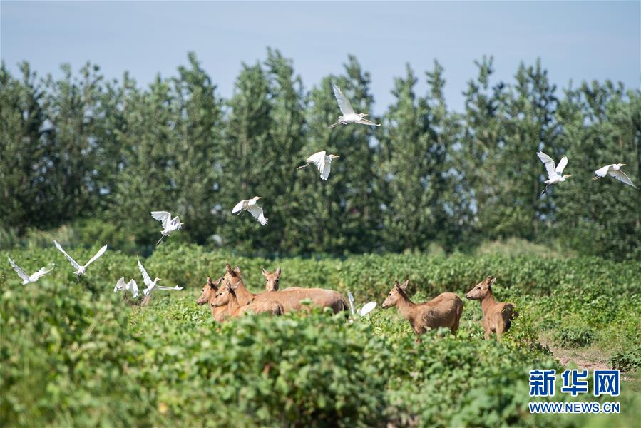 這是8月7日在東洞庭湖麋鹿和鳥類救治避難中心拍攝的麋鹿和飛鳥。位于湖南省岳陽市的東洞庭湖麋鹿和鳥類救治避難中心成立于2016年9月,占地400余畝,中心自建成后就承擔起東洞庭湖區域全部麋鹿的救援、醫治、康復和喂養任務。目前該中心共有14只麋鹿正在接受救助。新華社記者陳思汗攝