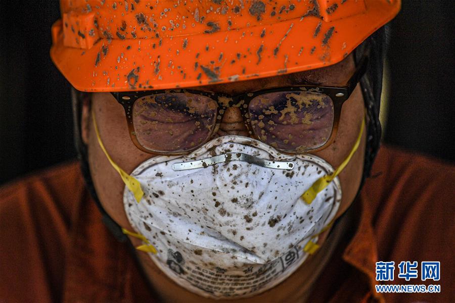 7月27日,在位于南海北部海域的勘探三號鉆井平臺上,一名鉆井工人在作業時眼鏡和口罩沾滿了泥漿。新華社記者蒲曉旭攝