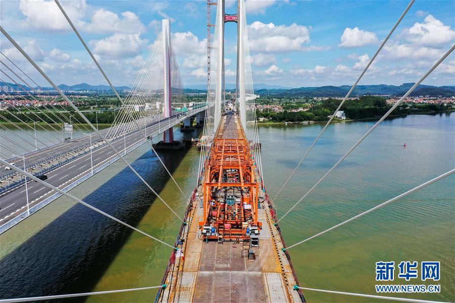 8月9日拍攝的廣州南沙港鐵路跨西江特大斜拉橋最后一塊鋼箱梁吊裝施工現(xiàn)場(無人機(jī)照片)。當(dāng)日,中鐵十一局承建的粵港澳大灣區(qū)基礎(chǔ)設(shè)施“硬聯(lián)通”重點(diǎn)工程——廣州南沙港鐵路跨西江特大斜拉橋完成最后一塊鋼箱梁吊裝作業(yè),大橋即將合龍。該橋位于廣東佛山市和江門市交界處,全長1117.5米。新華社記者劉大偉攝。