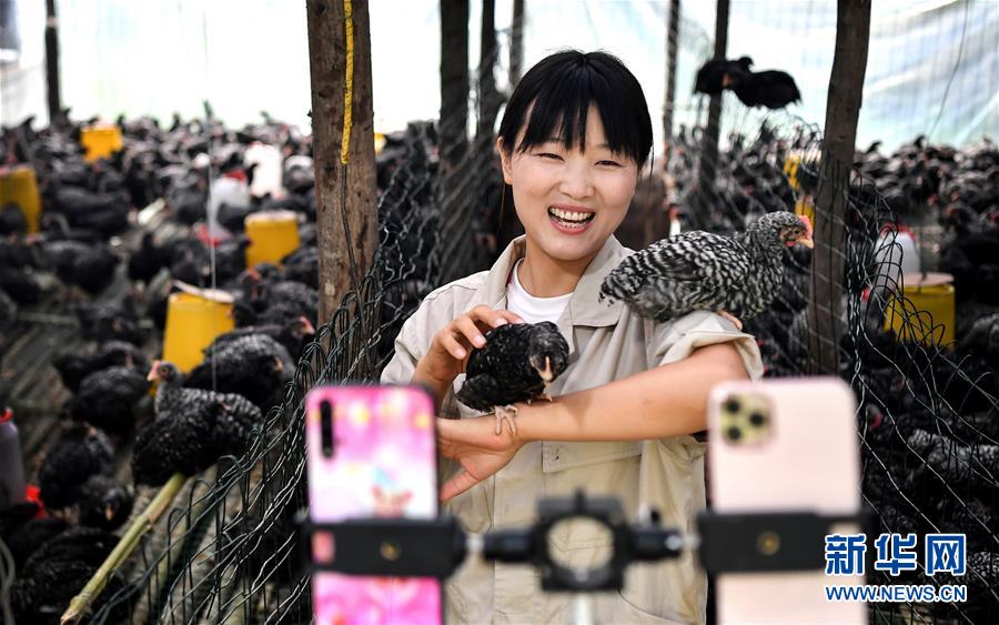 陜西商洛市丹鳳縣寺坪鎮寺坪村的網絡主播李萌在直播介紹自家養的蘆花雞(7月20日攝)。陜西丹鳳縣位于秦嶺東段南麓,依山傍水、農特產品豐富。近年來,隨著網絡銷售模式的興起,當地積極培育壯大“本土網紅”隊伍,通過網絡直播、線上銷售、線下配送等形式,助力秦嶺山區優質農產品走出大山,帶動百姓增收致富。新華社記者劉瀟攝。