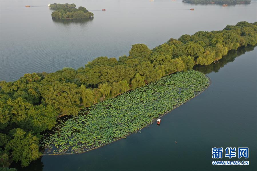 游客在西湖景區蘇堤附近觀賞荷花(6月30日攝,無人機照片)。新華社記者黃宗治攝。