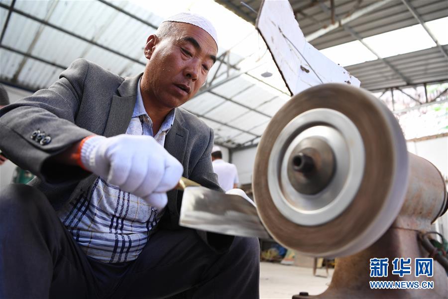 8月10日,甘肅省臨夏回族自治州積石山縣大河家鎮的村民馬得勝在制作保安腰刀。新華社記者陳斌攝。