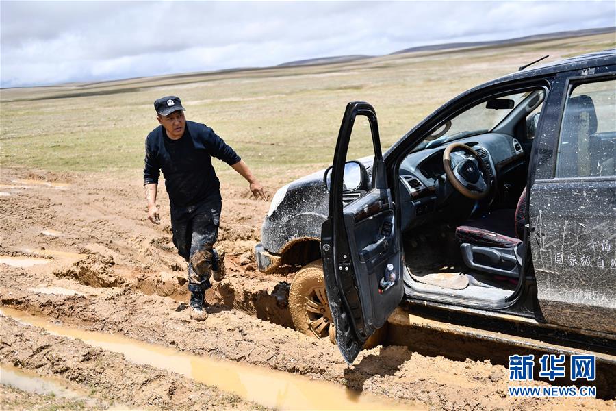 7月6日,卓乃湖保護站站長秋培扎西查看陷車情況。新華社記者張龍攝